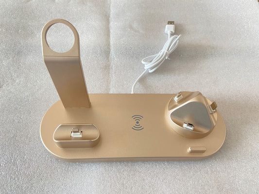 15W 4-in-1 desktop wireless charger: phone, headphones, and iWatch charging stand.