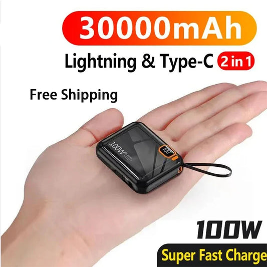 New 30000mAh Mini Power Bank PD100W Super Fast Charging USB To Type C Cable Two-way Portable Powerbank For iPhone Samsung Huawei